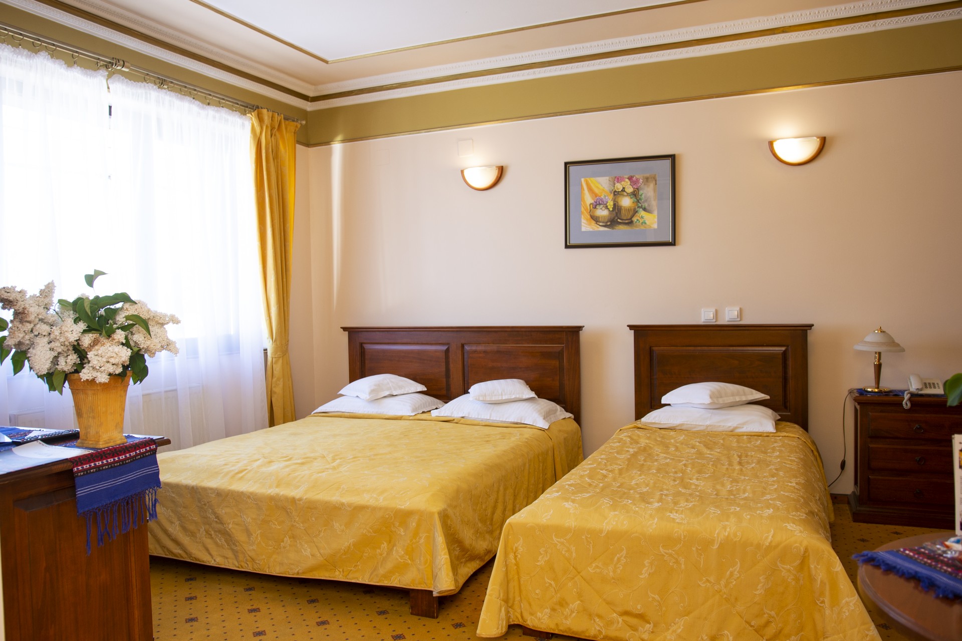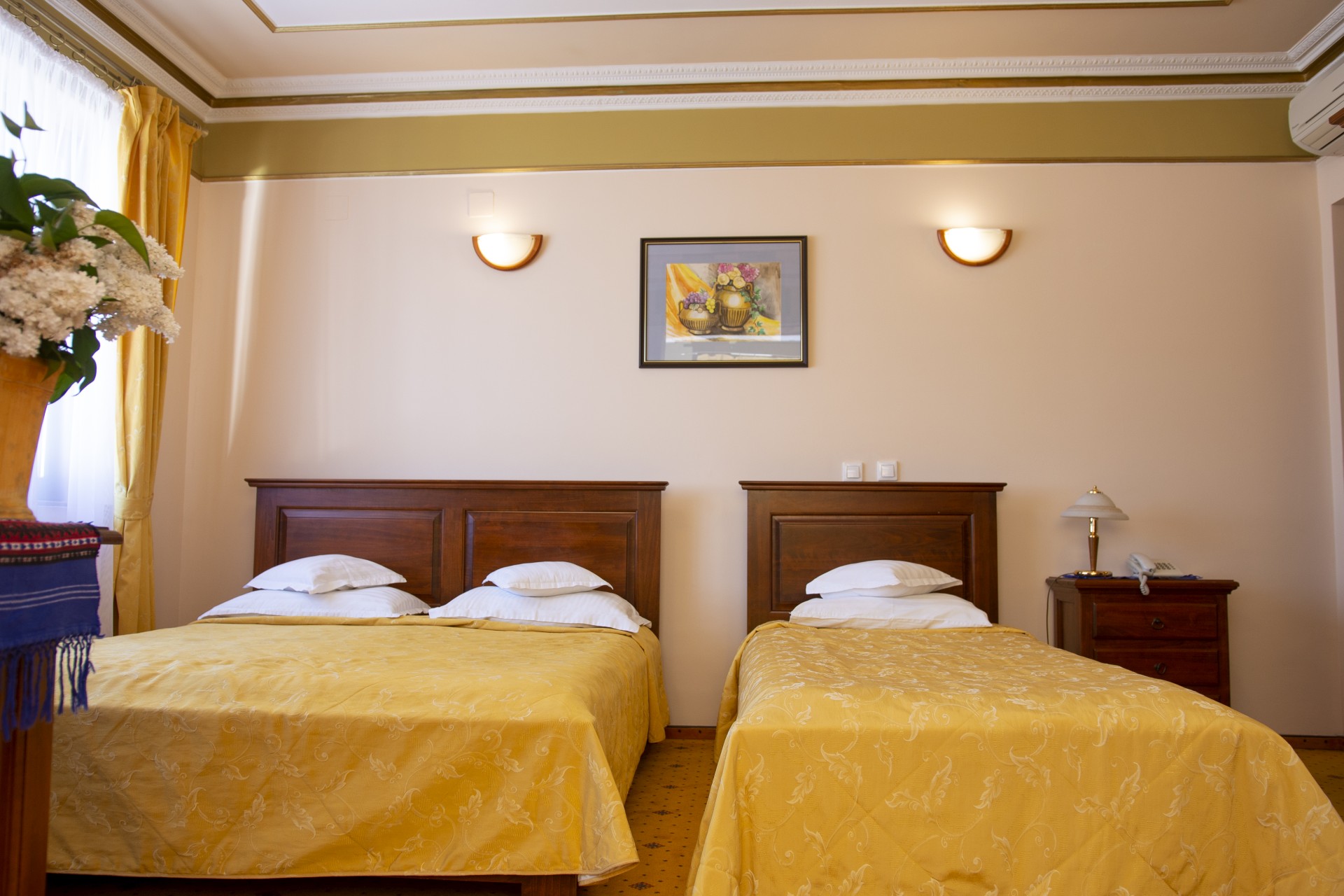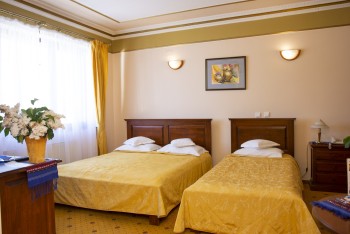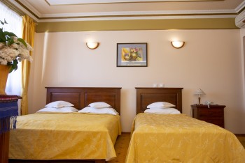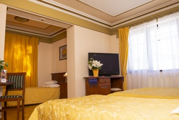 Camera cvadruplă este o camera luminoasă cu pat matrimonial sau cu două paturi, cu un design inedit, mobilier din lemn masiv, finisaje de inalta calitate. Camera are suprafata de 45 mp, dotată cu aer condiționat, telefon și dispune de o baie de dimensiuni generoase.